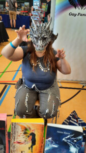 Ich rede gerne mit dem lesenden Publikum. Natürlich rede ich besonders gerne mit solchen, die meine Bücher kaufen. Aber auch Leute, die einfach nur ein bisschen zum Plauschen an den Büchertisch kommen, freuen mich. Es sind tolle, phantasiebegabte Menschen, nicht von der Blässe des Durchschnitts angekränkelt, besonders und eigen. Menschen, mit denen ich etwas anfangen kann. Wir gehören alle zur gleichen „Familie“ derjenigen, die lieber Drachensagen lesen als Bilanzen.